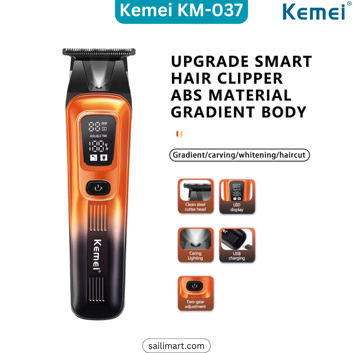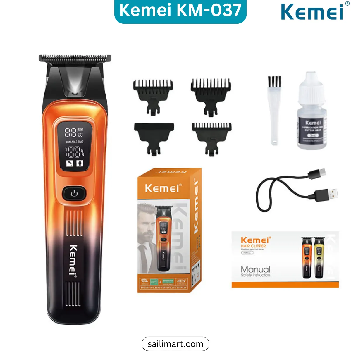 The Kemei KM-037 is a professional rechargeable hair clipper designed for both home and commercial use. With a high-speed motor, stainless steel blades, and long battery backup, it delivers smooth and precise trimming for hair, beard, face, and body grooming. Its ergonomic design and LED display make it reliable and user-friendly for daily use.