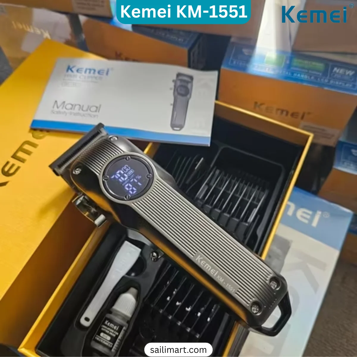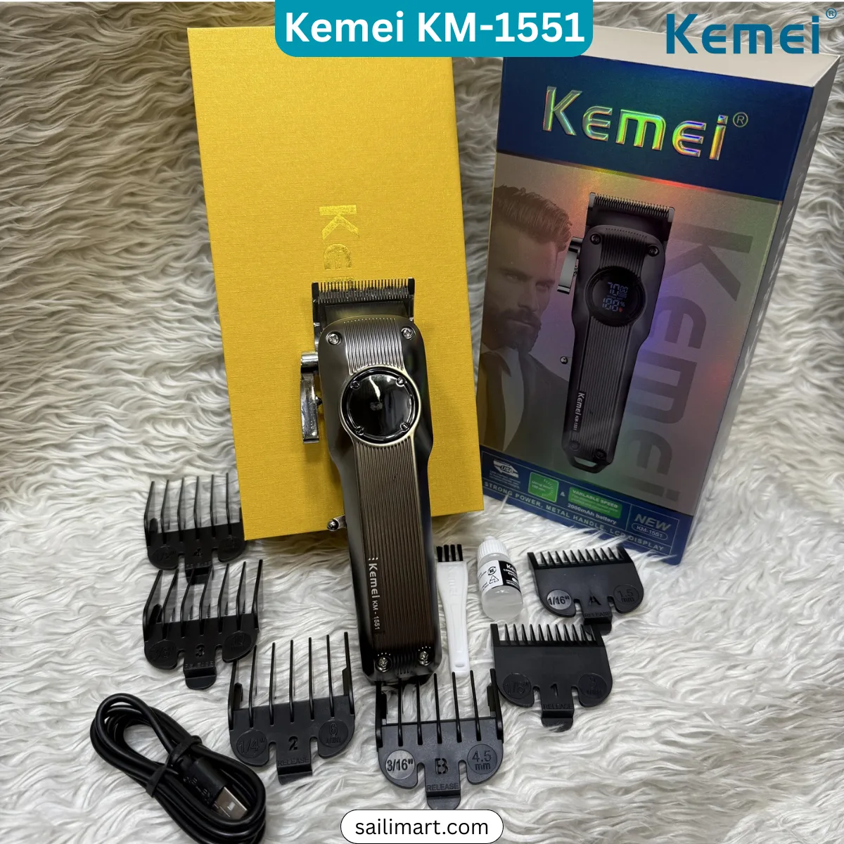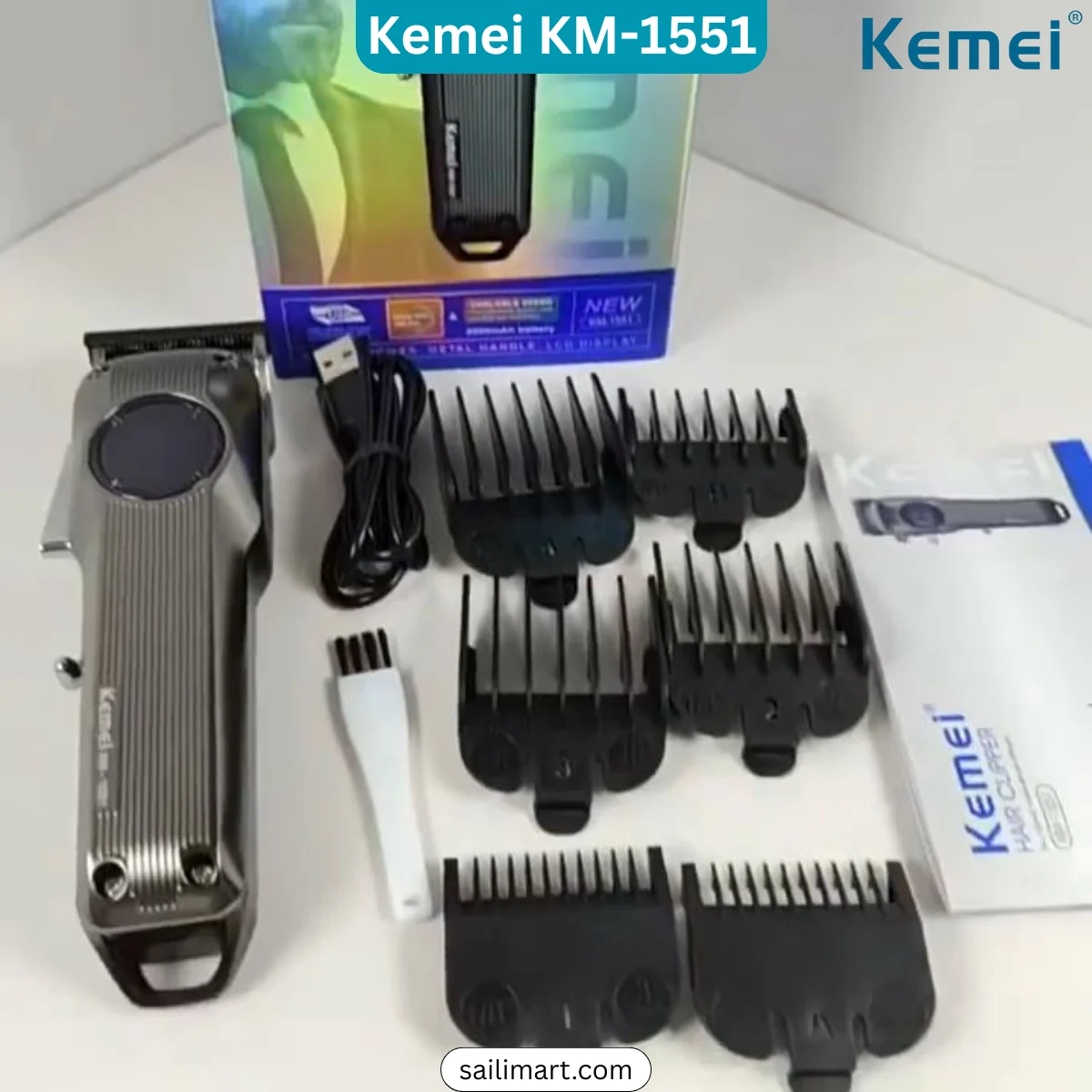 The Kemei KM-1551 is a professional cordless hair clipper designed for both home use and barber shops. It delivers precise cutting with a sharp stainless-steel T-blade. A powerful 5W motor ensures smooth speed and low vibration. The 2000mAh battery provides long runtime without frequent charging. USB Type-C charging adds convenience for travel and daily use. With 6 guide combs, it handles haircuts, fades, beard shaping, and grooming tasks easily.