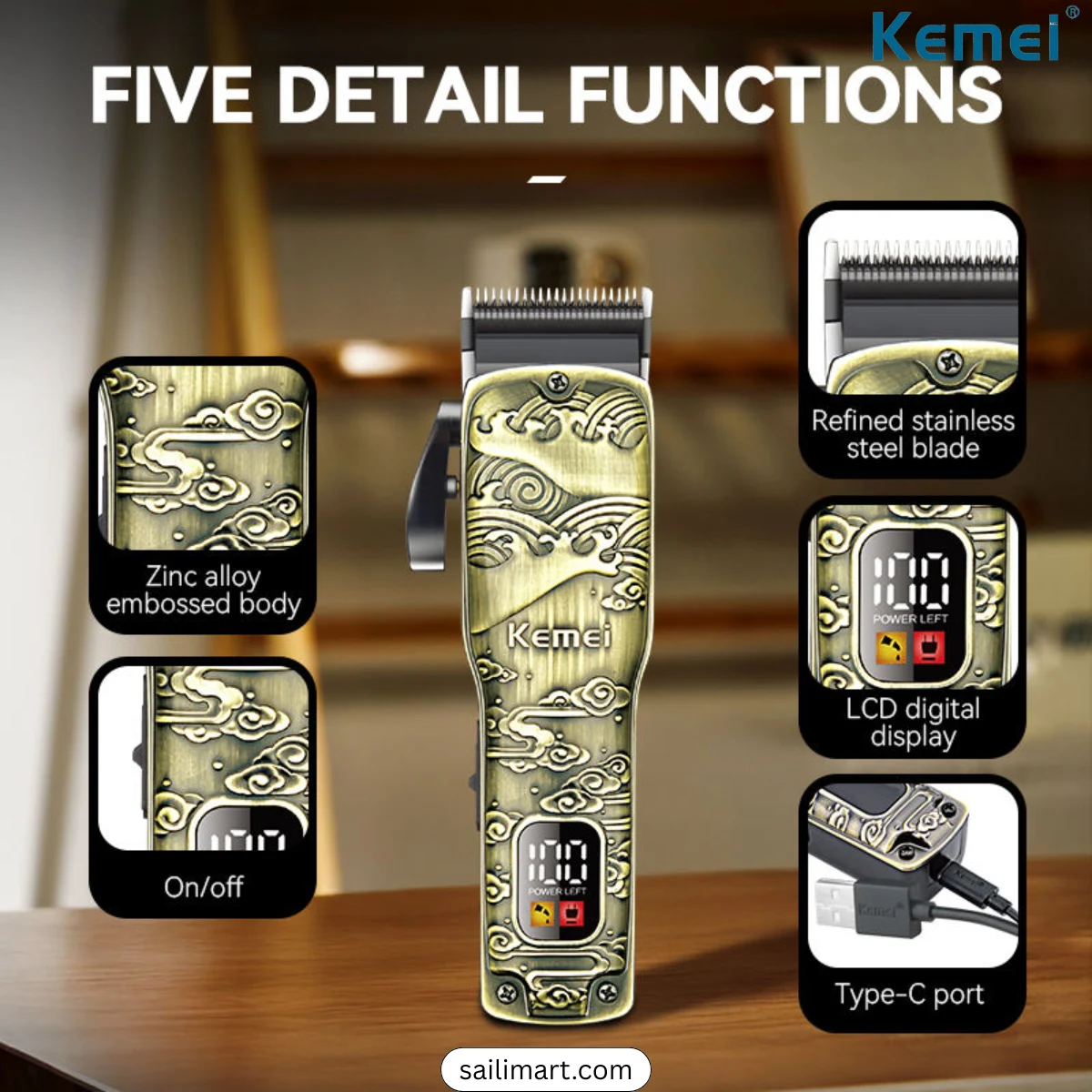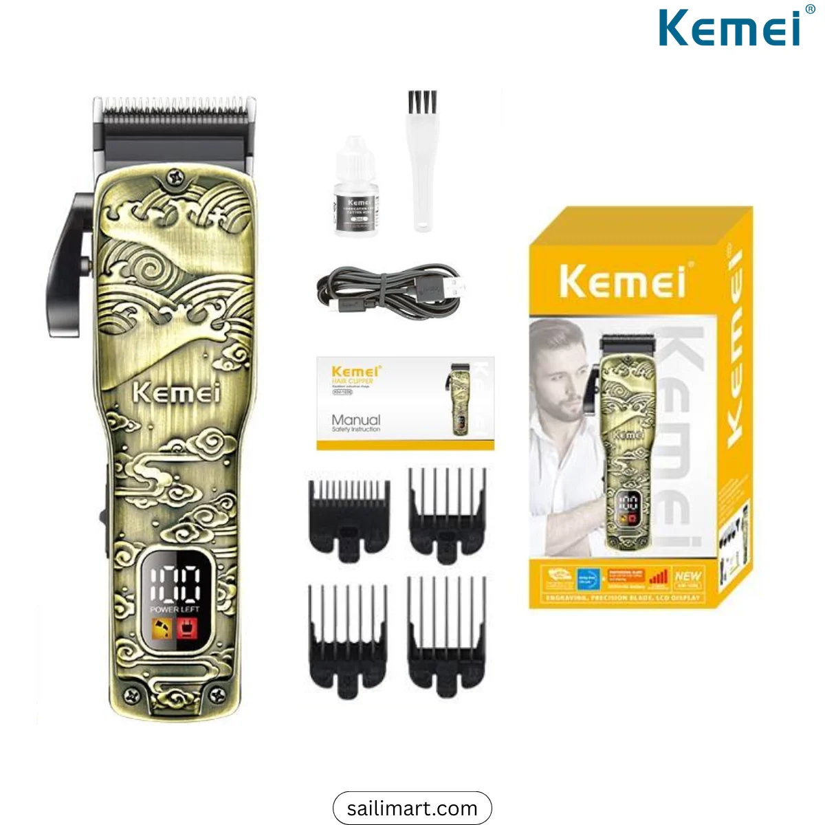 The Kemei KM-1696 is a premium-grade professional trimmer designed for smooth, precise, and powerful trimming. It comes with a high-speed 6800 RPM motor, ensuring fast and even cutting for all hair types. The all-metal body gives it a durable, premium feel, while the digital display keeps you informed about battery status and speed settings. Perfect for both salon and personal grooming, this trimmer delivers a combination of power, performance, and style.