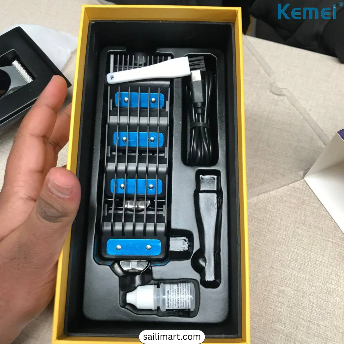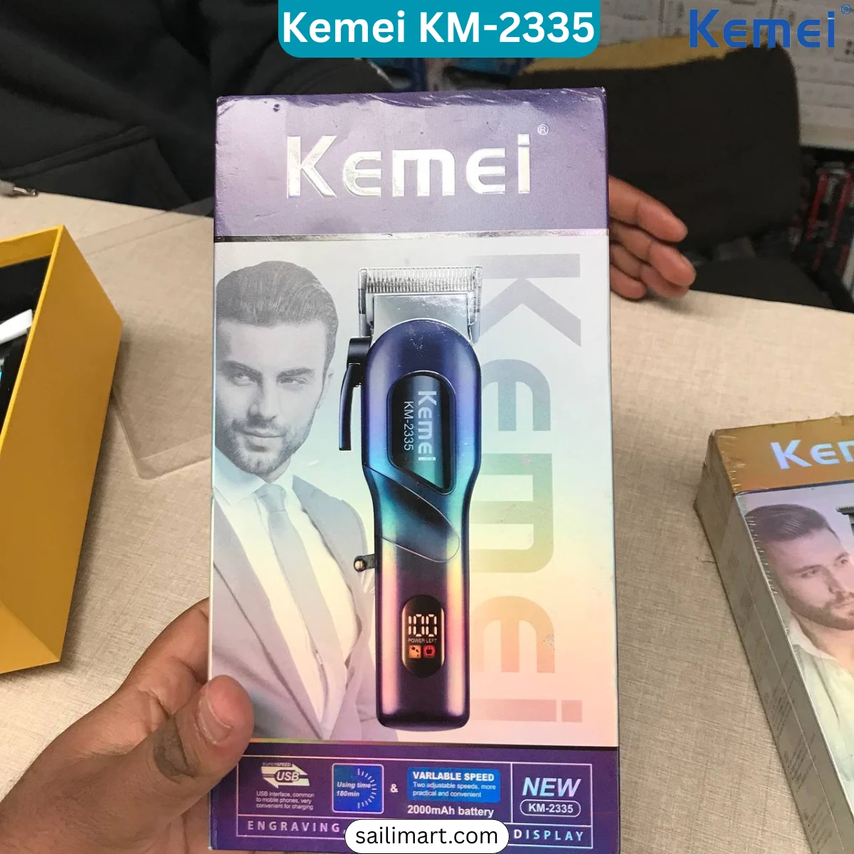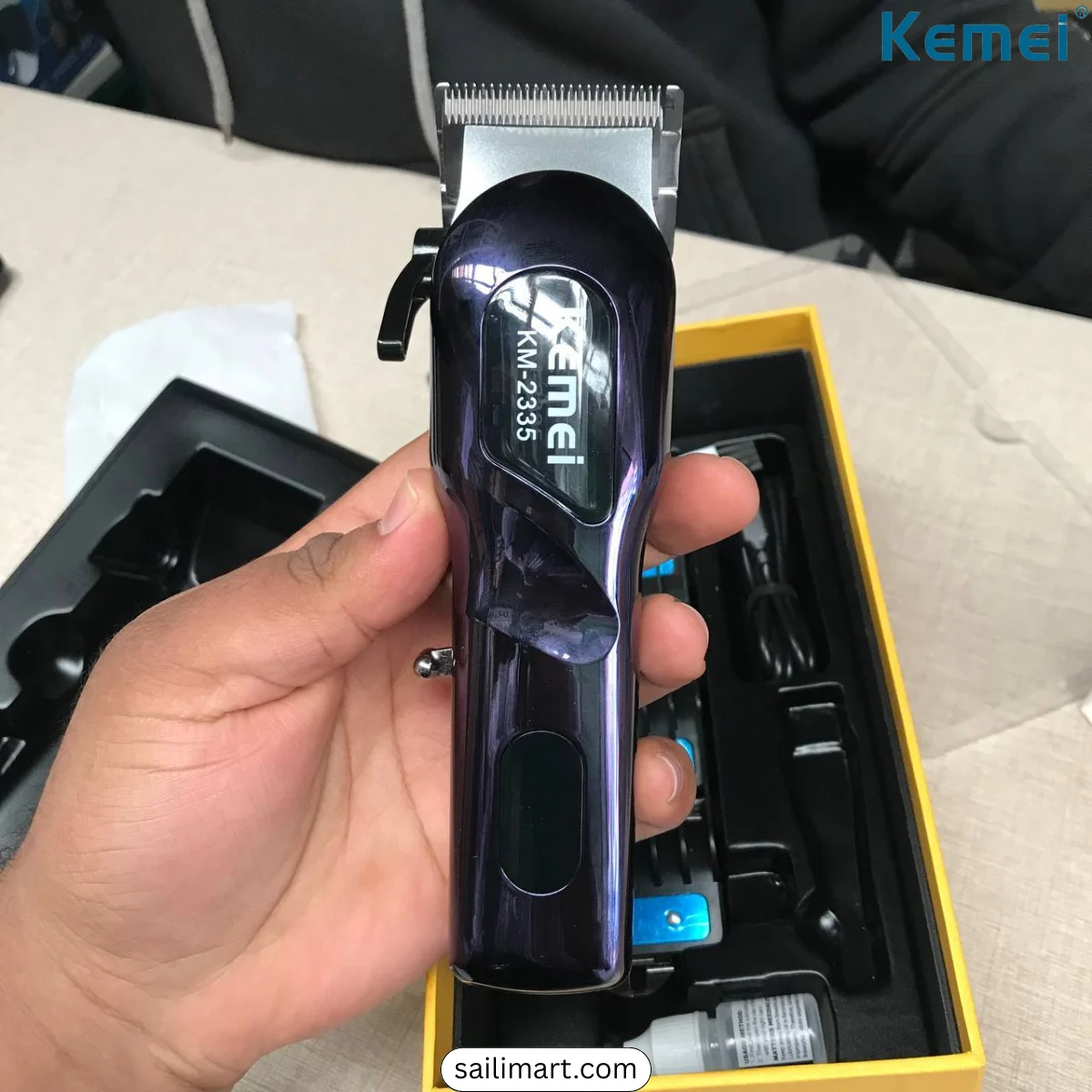 The Kemei KM-2335 Professional Cordless Hair Clipper & Beard Trimmer is built for precise and powerful grooming. It features sharp stainless steel T-blades, a 6500 RPM rotary motor, and a high-capacity 2000mAh lithium-ion battery that delivers up to 180 minutes of cordless use. An LCD display shows real-time battery status for added convenience.