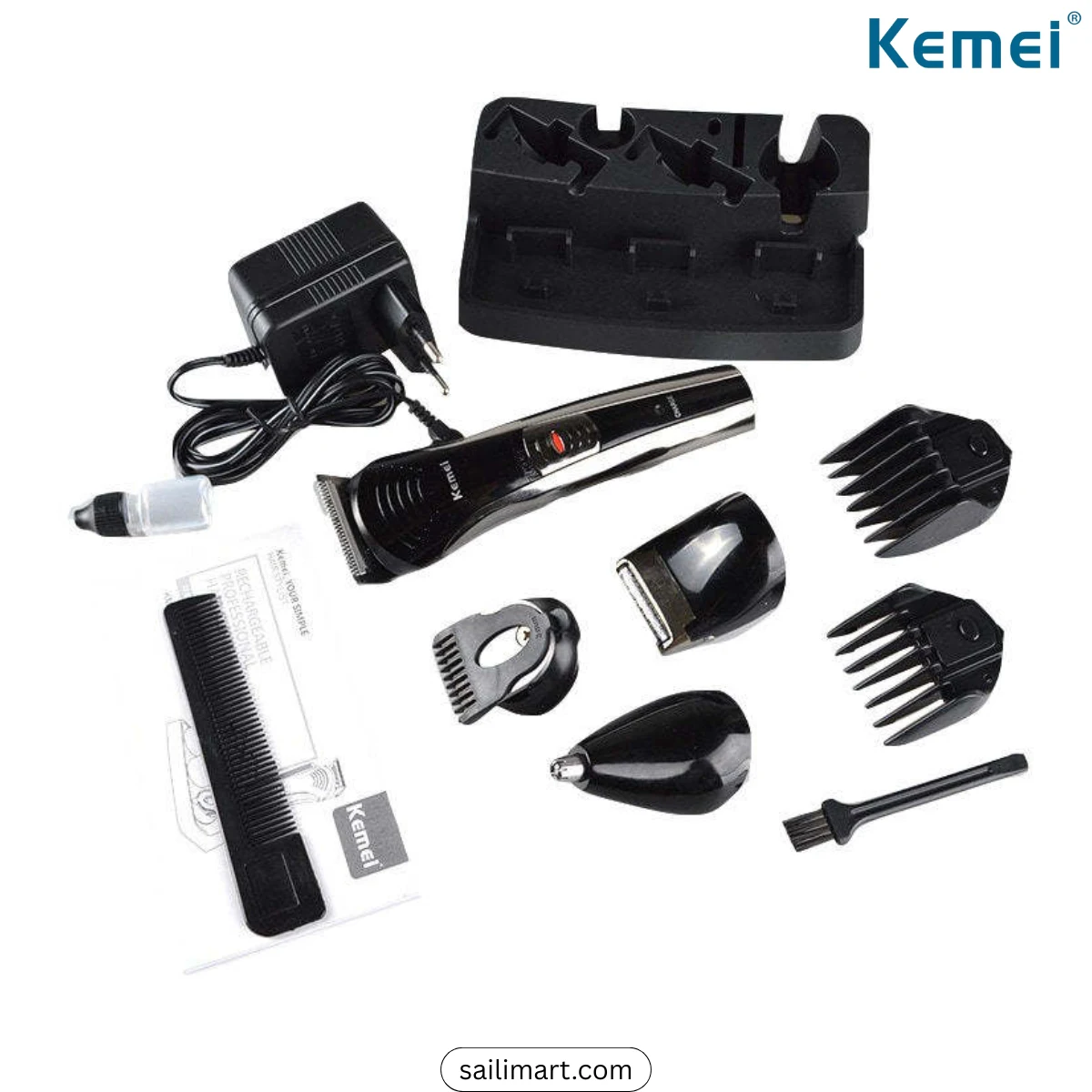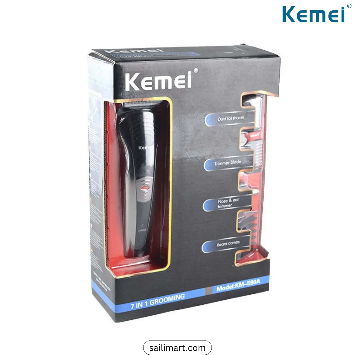 The Kemei KM-590A is a versatile 7-in-1 grooming kit designed for men. It works as a beard trimmer, hair clipper, nose and ear hair trimmer, and dual-foil shaver. This rechargeable and cordless kit ensures convenient grooming at home or during travel. Its compact design and adjustable guide combs make it ideal for precise styling.