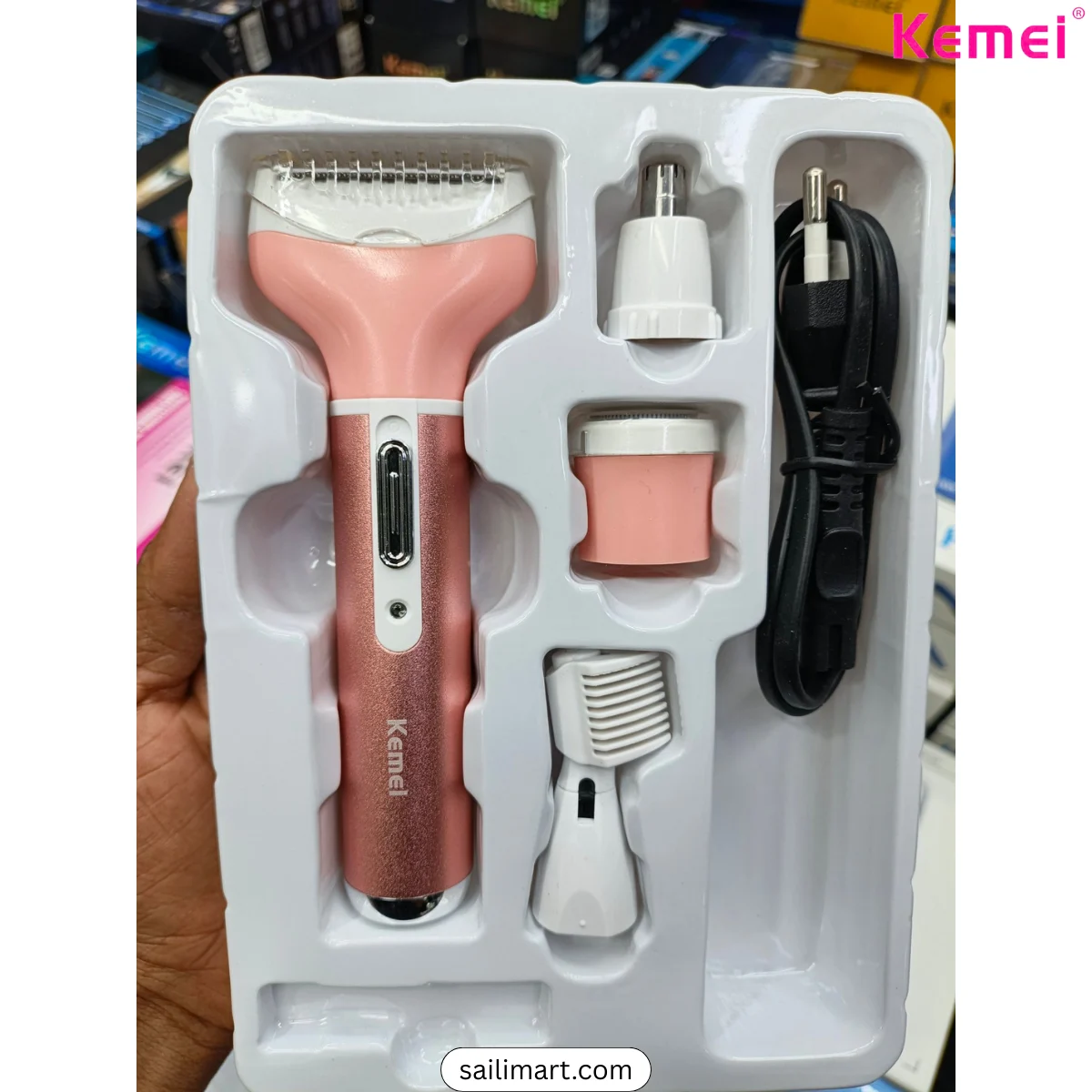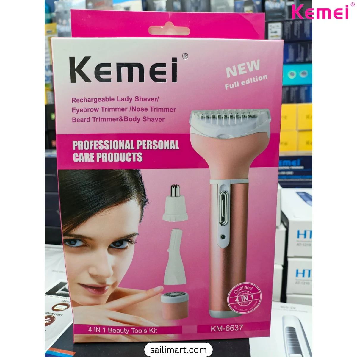 Kemei KM-6637 is a multi-functional grooming device designed for women. It comes with four interchangeable heads, allowing you to shave, trim, shape eyebrows, and remove nose hair with ease. This rechargeable and portable device ensures a smooth and irritation-free grooming experience.