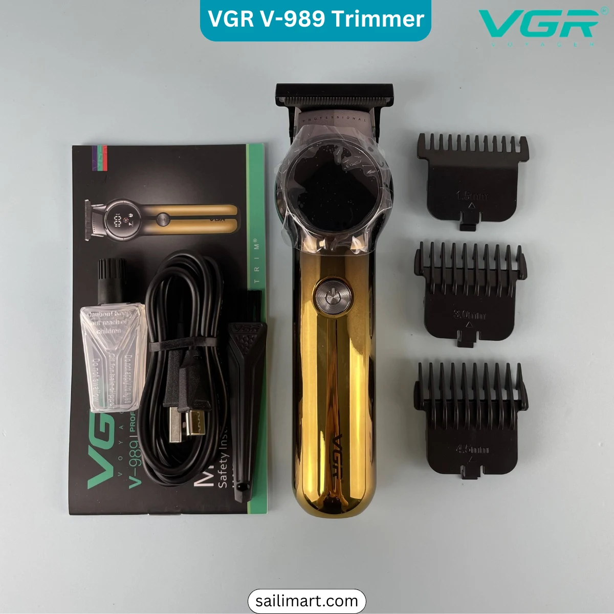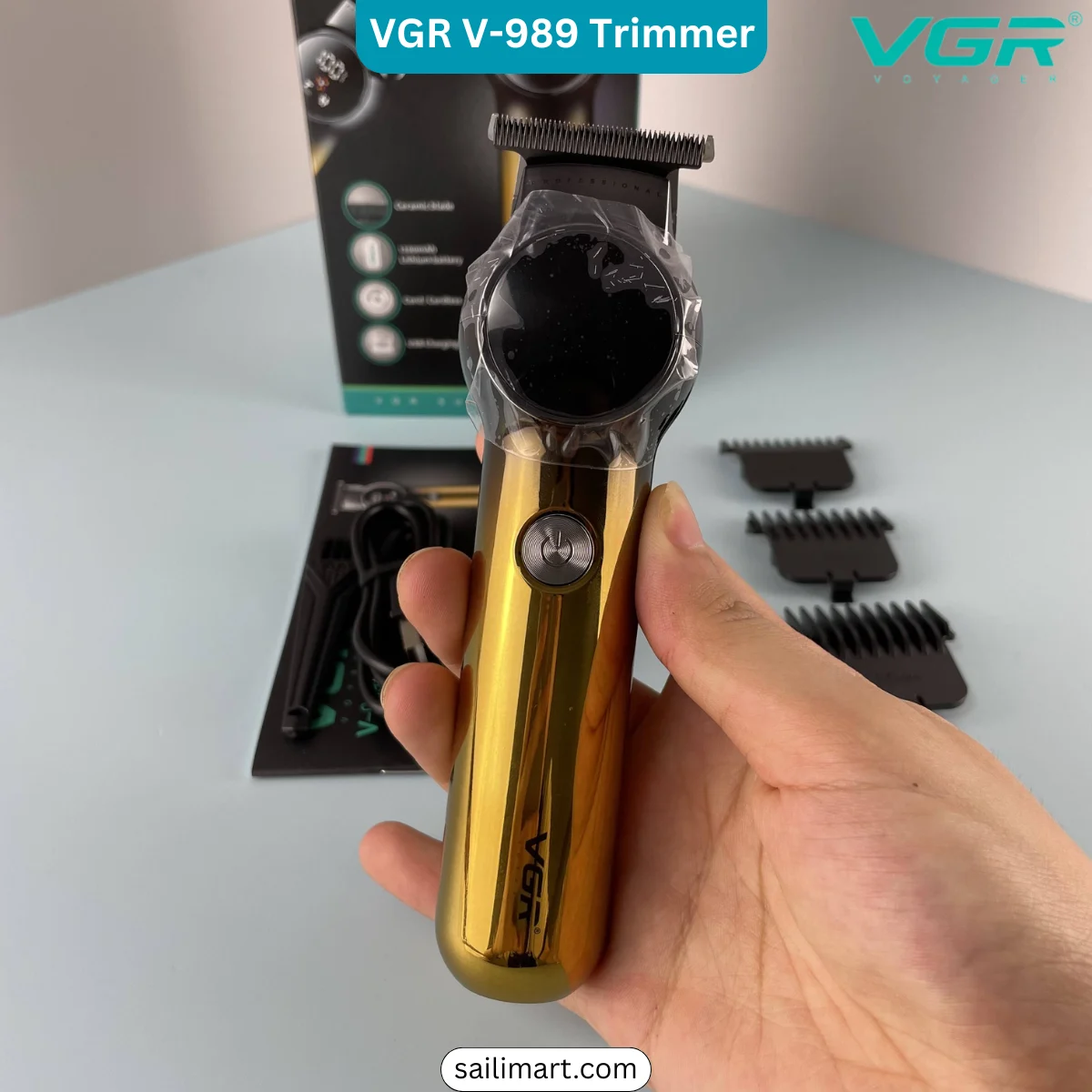 The VGR V-989 is a professional hair clipper and trimmer designed for precision cutting and styling at home or in salons. Equipped with ceramic and powder metallurgy blades, a powerful 1200mAh lithium-ion battery, and dual speed/Turbo mode, it ensures smooth, efficient haircuts. The LED display provides real-time monitoring of battery status, oil indicator, and Turbo function, making it easy to use.